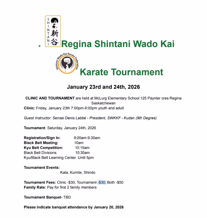Regina Clinic and Tournament next weekend January 18, 2026 / moosemountainkarate Here is the information poster about the Regina Tournament and clinic happening this coming Friday and Saturday. Share this:Share Email a link to a friend (Opens in new window) Email Share on Bluesky (Opens in new window) Bluesky Share on Facebook (Opens in new window) Facebook Share on Pinterest (Opens in new window) Pinterest Print (Opens in new window) Print Share on X (Opens in new window) X Like Loading...